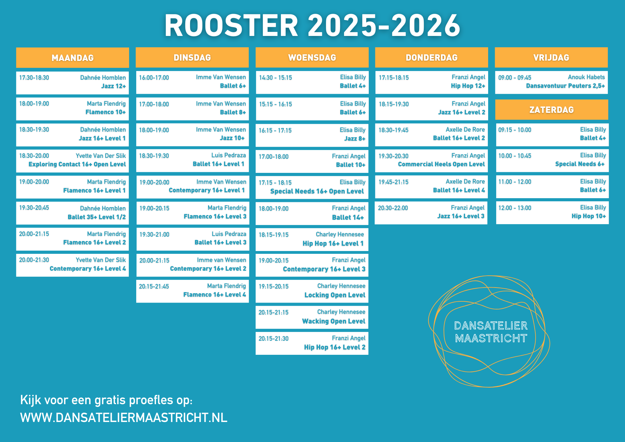 Dance Studio Maastricht: the place for everyone who loves to dance! Bold, elegant, energetic, classical, or contemporary — with us, you’ll always find a dance style that suits you. Whether you prefer a course or an inspiring workshop, fun, attention, and quality are our priorities. Everyone is welcome: young and old, beginner or advanced! Discover our diverse classes: Hip Hop, Jazz Dance, Modern Dance, Classical Ballet, Flamenco, Toddler Dance, Preschool Dance, and special classes for people with disabilities. With us, you grow not only as a dancer but also as a person — always in a safe and positive environment. Creativity and connection are at the heart of our dance school.